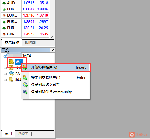 3.更始办事器,一个平台会有良众个办事器,假使你所登录的办事器处于贯穿形态,直接就登录了,不必要更始;假使MT4联网不佳或者正在登录时填入了新的办事器则必要更始后技能登录。正在导航栏 右击 账户 开新模仿账户,就能够看到没有平常贯穿的办事器。点击扫描即可,当你所要登录的办事器贯穿平常了,账户就主动登录了。