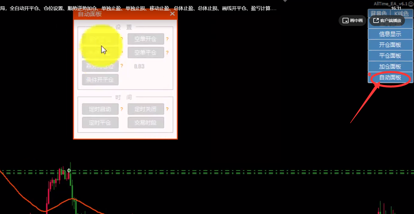 EA主动买卖用具的功效构造,全主动开平仓、仓位创立、顺势逆势加仓、零丁止盈、零丁止损、转移止盈、总体止盈、总体止损、画线开平仓、盈亏揣度….