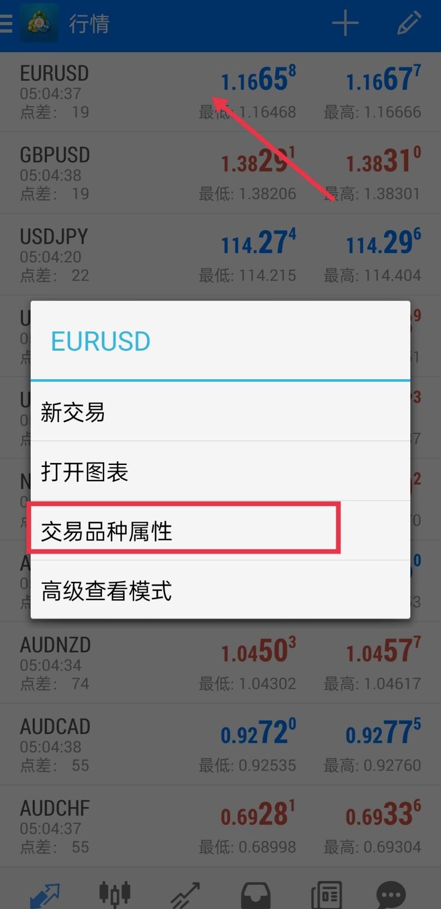 第一步:登录安卓手机版MT4,点击一下己方思查看音信的种类,点击小编象征营业种类属性。