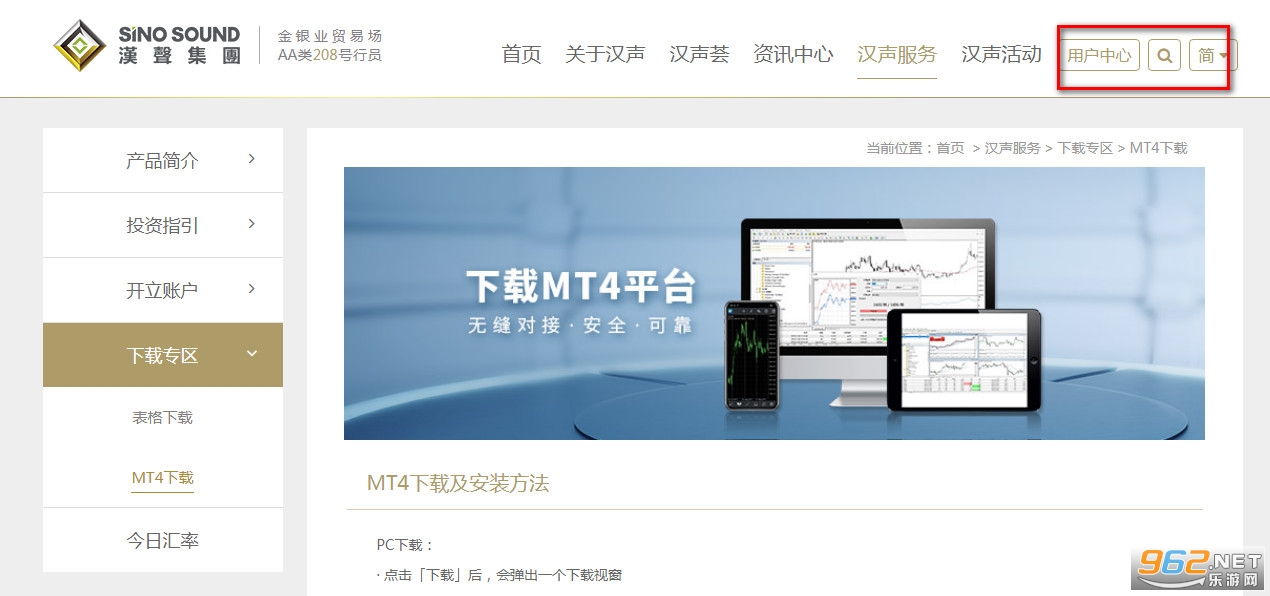 1、复造汉声贵金属app(MetaTrader 4)官网地点进入,标记左侧的“用户中央”字样