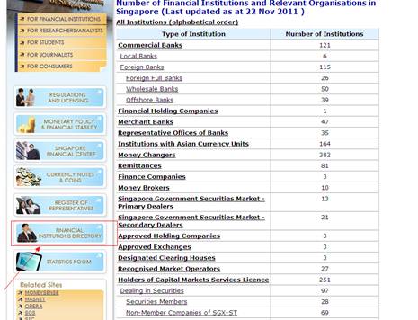 第二步:然后点击左侧的“FINANCIAL INSTITUTIONS DIRECTORY(金融机构通信录)”,咱们就会看到回收新加坡金融监禁局(MAS)的通盘金融机构。