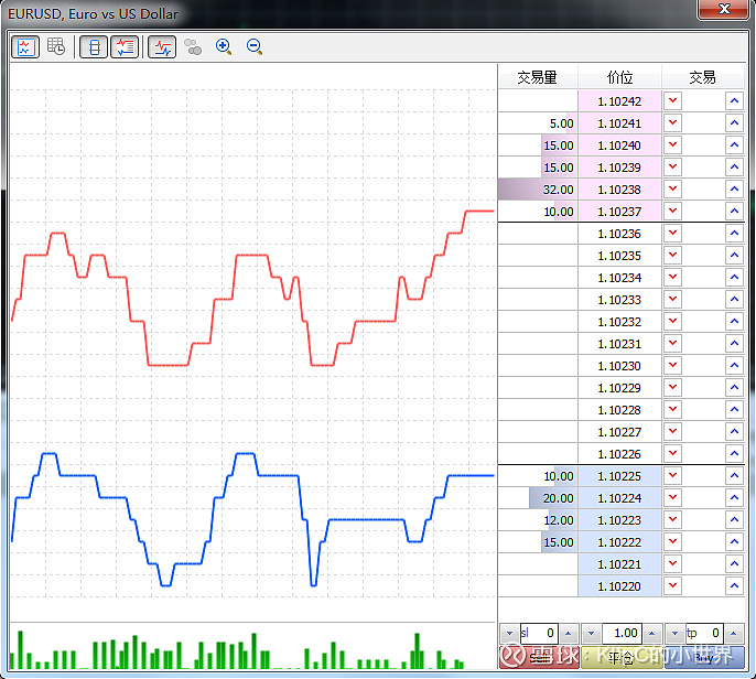 MetaTrader5供给深度的交往数据,囊括每个交往的时候,偏向,价钱和交往量的记实,交往量显示为带有差异交往偏向颜色代码的直方图: