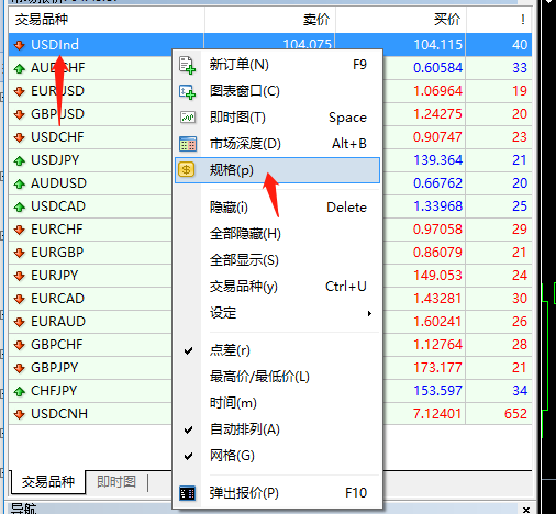 第一步:翻开mt4软件,点击USDIND(美元指数),体系会弹出一个页面,行家点击规格。