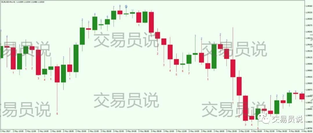 当价值走势收盘价低于四个时段前烛炬收盘价时,看削价值转移的“ 1”被标识。然后不才一个柱形上,当价值走势收盘价低于四个时段前的收盘价时,绘制“ 2”。此法规合用于全豹后续规范。