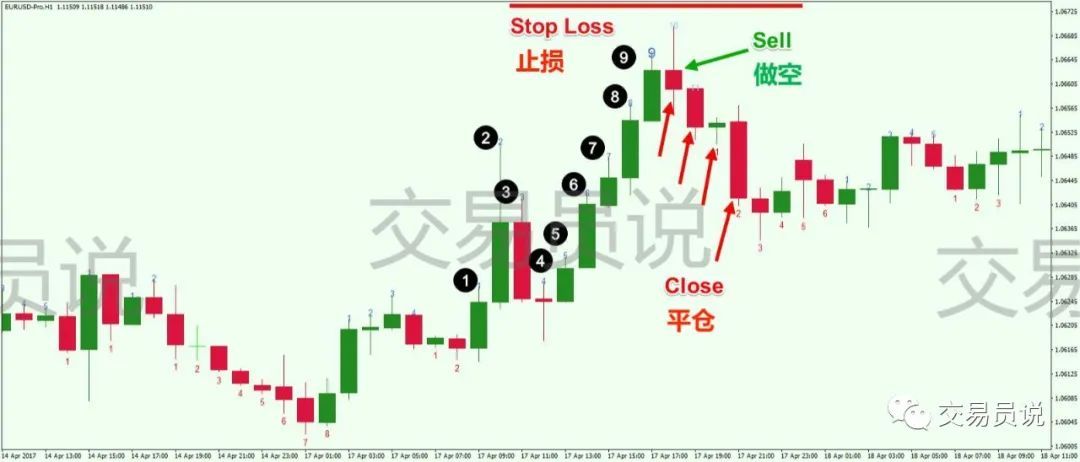 开始,你需求有一个看涨的趋向。然后,咱们将需求得回9个贯串周期,每个周期的收盘价要比前4个烛台的价值高。正在取得数字“ 9”时,你应当正在该时刻完成时做空商场。