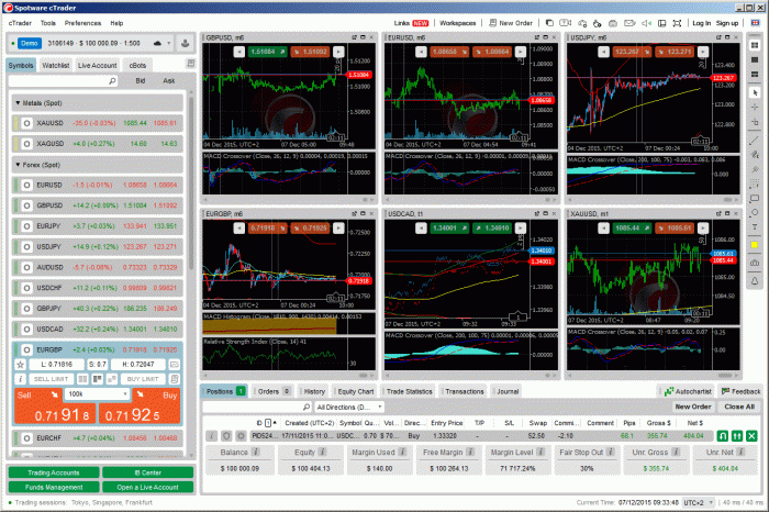 cTrader正在扫数使用(包含手机使用)上供给80众种默认的目标和图外性能。正在任何界面上增添、转移和删除性能都很简单。图外的缩放、时刻、颜色、尺寸和其它实质完整可能定制。正在桌面使用中,你还可能拆分各样图外,轻易从众个屏幕上查看,其它性能如解除订单或者史册订单也都可能举行同样的操作。