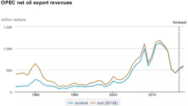 ▲欧佩克石油出口净收入(左轴,单元10亿美元)(数据由来:美邦能源音讯局)