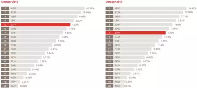 ▲群众币正在邦际支出当中的占比改变(2015年10月VS2017年10月)(数据由来:SWIFT)