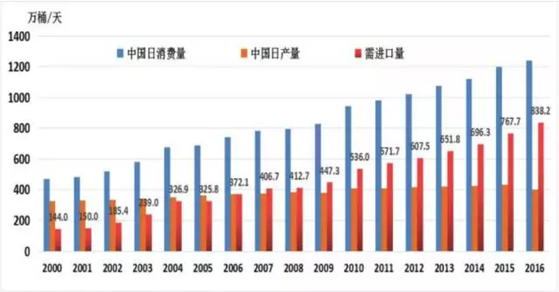 2000年至2011年,中邦石油消费量年均延长6.5%足下,大幅高于环球均匀增速1.2%;纵然正在2011年之后,我邦石油需求增速出手放缓,到2016年降至3.23%,但仍远远高于环球1.6%的增速水准,是原油消费最大需求增量由来邦。2016年,中邦日均进口838.2万桶原油,相当于宇宙第一产油大邦沙特日产量(1023万桶)的八成以上。