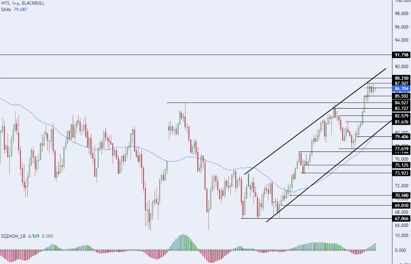技艺上,油价反弹至上升通道上畛域后,油价正在总体上涨趋向中进入一波窄幅振动生意。如图所示,假设油价上涨,方针价位将差别为 87.40 和 88.25。另一方面,假设代价下跌,支持位能够差别纠合正在85.25和84.52。