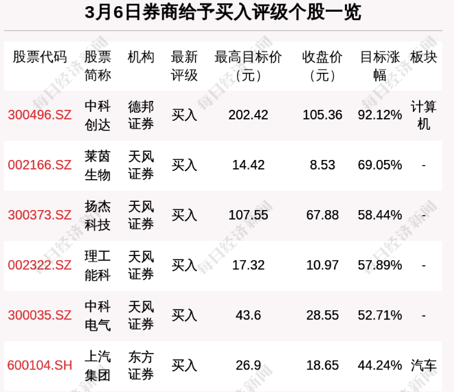 每经AI疾讯,3月6日,券商赐与评级的个股数共有39只,得到买入评级的个股数共有28只。正在宣告了宗旨代价的10只个股中,遵循最新收盘价估量,预期涨幅排名居前的个股是中科创达、莱茵生物、扬杰科技,预期涨幅永诀是92.12%、69.05%、58.44%。