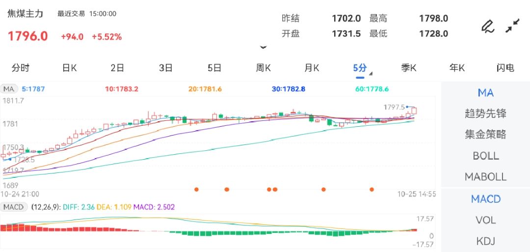 10月25日,邦内期市煤炭板块涨幅居前。此中,焦煤期货主力合约开盘报1731.5元/吨,今日盘中高位振动运转;截至午间收盘,焦煤主力最高触及1795.0元,下方探低1728.0元,涨幅达5.05%。