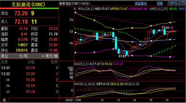 原油行情了解:周一原油代价高开,早盘高点触及72.6承压,及时现报价72.2一线。从周期来看原油代价并不算统统止跌,本周周线MACD绿色动能柱连接放量,周线合口,日线布林带中轨和日线准绳偏差带支持粘合承压73.5一线,同时光线SAR目标延长点阻力也正在73.5职位。更上方参考4小时准绳偏差带目标上轨74.1和上周众次提示的74.5酿成的压造阻力范畴。