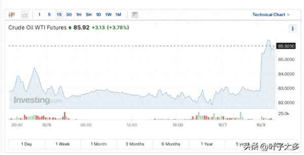 据财联社报道,跟着巴以冲突连续升级,周一亚市早盘邦际油价飙升,WTI原油创史乘新高逾4%。截至9日上午10点,WTI原油期货上涨3.78%至85.92美元/桶;布伦特原油期货上涨3.61%至87.63美元/桶。