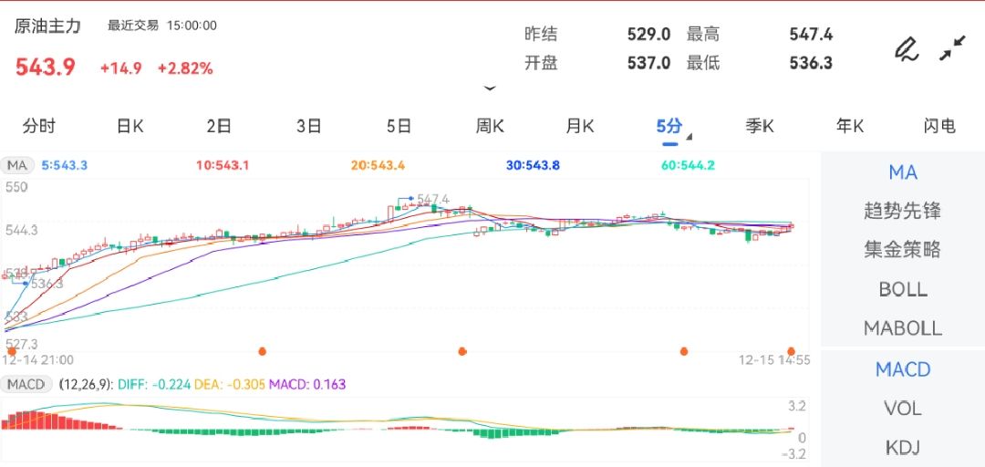 12月15日,邦内期市能化板块大面积飘红。个中,原油期货主力合约开盘报537.0元/桶,今日盘中高位震撼运转,截至午间收盘,原油主力最高触及547.4元,下方探低536.3元,涨幅达3.06%。