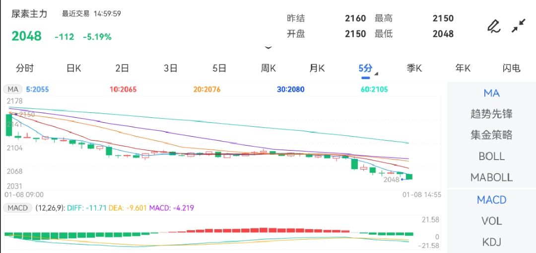 1月8日,邦内期市能化板块大面积飘绿。个中尿素期货体现振动下行走势,截止午间收盘主力合约大幅下跌3.33%,报2088元。
