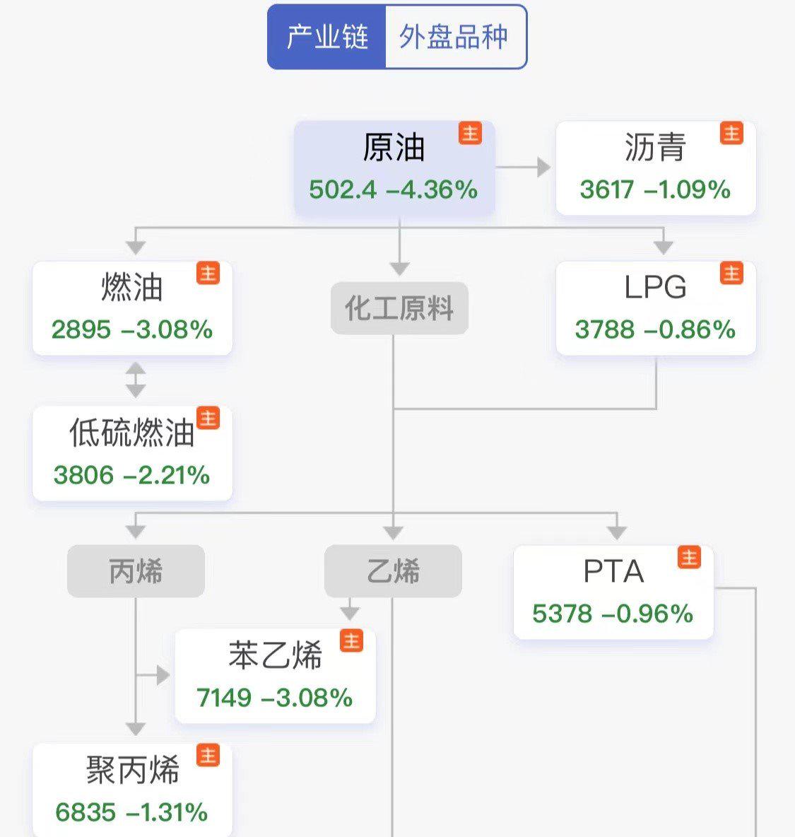 与此同时,邦内方面,期货墟市原油系众种类展示下跌!同花顺期货通数据显示,原油主力合约大跌超4%,价钱迫临500元/桶,创近两周以后的新低;其它,燃油、苯乙烯等种类跌幅均超3%,低硫燃油、PTA等均有肯定跌幅。