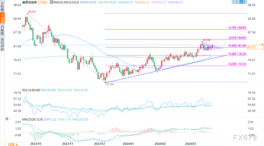 WTI原油期货(5月交割)从客岁12月67.97的底部稳步回升,上周全达近5个月高点83.10。然而,因为价钱仍旧向下反转,并正在95.02-67.97的50.0%斐波那契回撤位邻近造成了一个对称的三角形,上涨相似一时被弃置了。