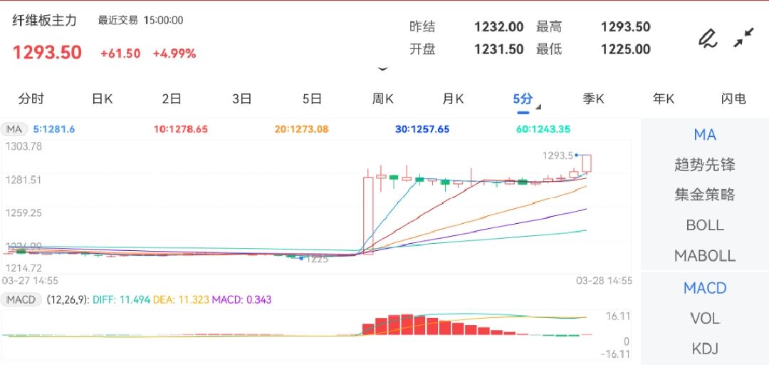 3月28日,纤维板期货午后大幅走高。截止发稿纤维板主力合约最高上探1287.00元/吨,最低下触1225.00元/吨,涨幅3.45%。