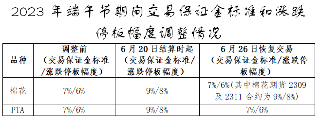 一、自2023年6月20日结算时起,棉花PTA期货合约的交往保障金圭臬调节为9%,涨跌停板幅度调节为8%。
