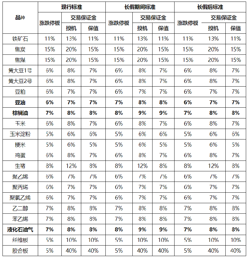 豆油、棕榈油和液化石油气期货合约涨跌停板幅度和交往保障金秤谌规复至节前圭臬;其他期货合约涨跌停板幅度和交往保障金秤谌保持稳固。