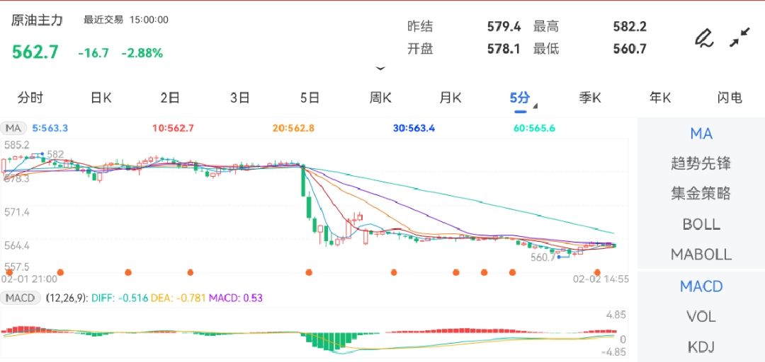 2月2日盘中,原油期货主力合约境遇一波急速下挫,最低下探至562.6元。截止发稿,原油主力合约报564.3元,跌幅2.61%。