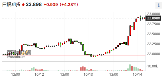 现货黄金也同样涨约60美元,收报每盎司1930.26美元,涨幅超3.2%,本周累涨5.2%。12月交割的白银期货代价上涨0.93美元,报每盎司22.898美元,涨幅为4.28%,本周累涨5.4%。