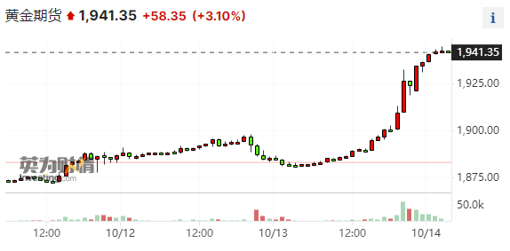 纽约商品业务所黄金期货商场交投最活泼的12月黄金期价较前一业务日上涨58.5美元,收报每盎司1941.5美元,涨幅为3.10%,本周累涨5.2%,自9月28日今后重回1900美元上方。