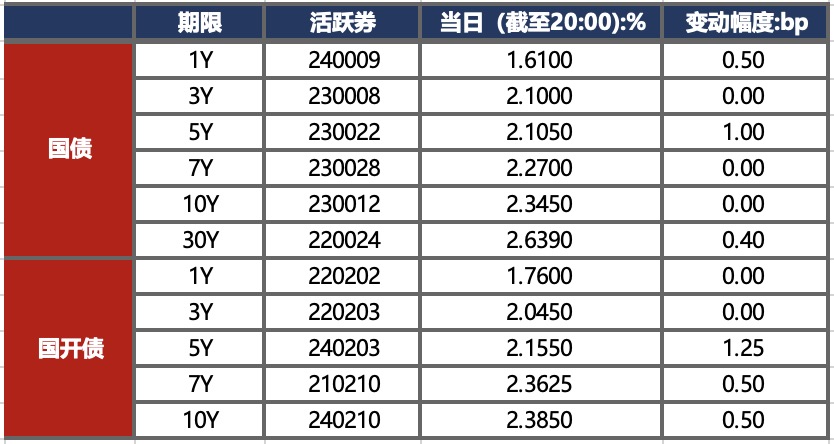5月20日,早盘受地缘政事要素影响,避险激情升温,债市延续暖势,但尾盘资金面偏紧促进债市回调。全天看,银行间厉重利率债收益率窄幅颠簸。截至北京年光20:00,10年期邦债灵活券230012收益率持平于2.3450%;10年期邦开债灵活券240210收益率上行0.50bps至2.3850%。