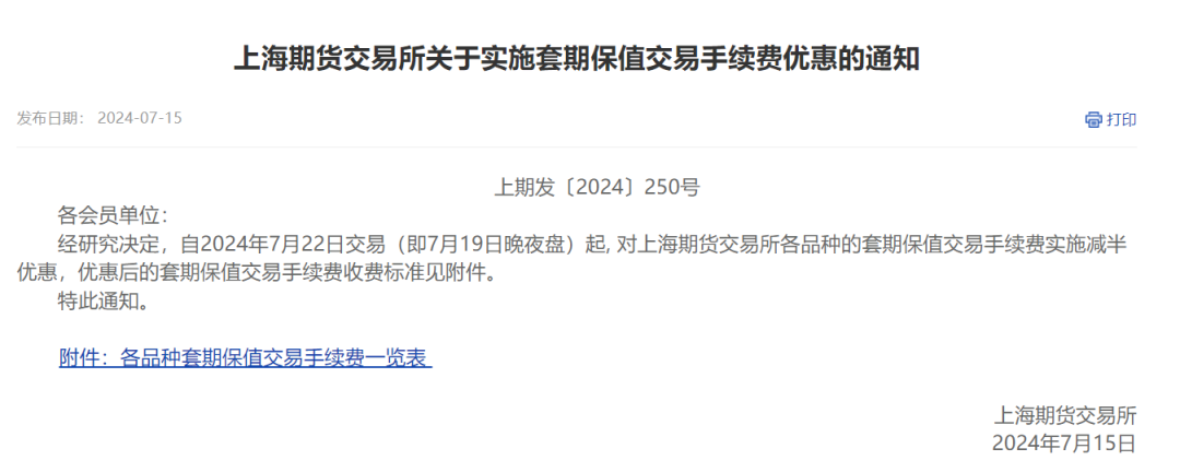 记者提神到,除上期所外,7月15日同日,大商所也公布了套期保值买卖手续费的相干优惠通告。