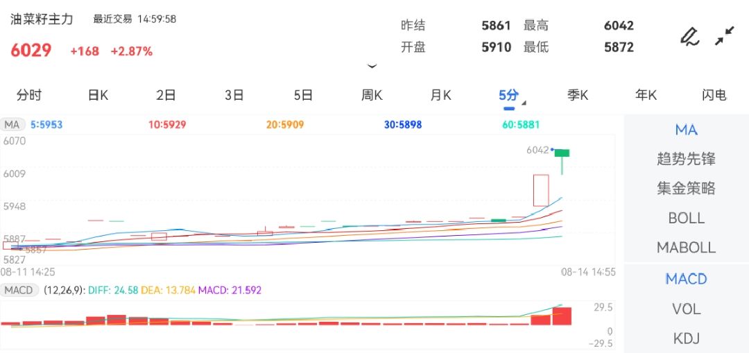 8月8日,礼拜二,油菜籽期货主力合约开盘报5867元/吨,最高上探5899元/吨,最低下触5867元/吨,截止发稿,油菜籽主力报5899元,涨幅0.55%。