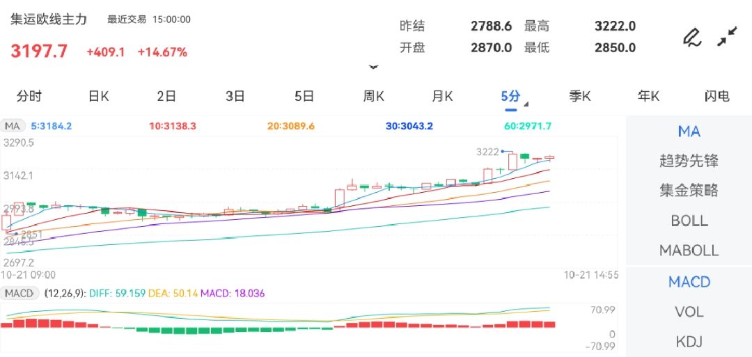 欧线绕行一连 集运指数短期或挑拨3300一线日盘中,集运指数(欧线)期货主力合约境遇一波急速上涨,最高上探至3203.2点。截止发稿,集运指数(欧线%。