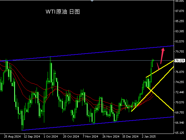原油从日线图级别看,中期走势即将测试区间上沿78.80一线。均线体例呈众头分列,中期客观趋向偏向为区间内向上。K线接续拉升大实体阳线,众头动能阐扬充沛,体贴宽幅区间上沿对油价的阻力功用,若打破则进一步翻开原油上涨空间,中期正式进入涨势节拍。