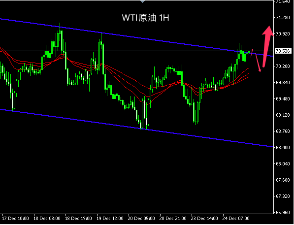 原油短线H)走势体验圣诞假期,小幅振撼走高。均线体例呈众头摆列,短线客观趋向目标向上(区间规模内)。从动能看,众空力度相互胶着,估计日内原油短线走势振撼小幅走高概率较大。
