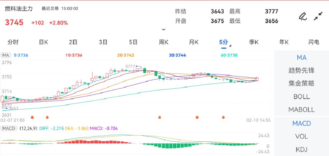 金投网APP行情中央数据显示,截止2025年2月10日下昼15:00收盘,燃料油期货主力合约行情音讯:最新价:3745,涨跌:102,涨跌幅:2.80%,成交量:413788,开盘价:3675,昨收价:3679,最高价:3777,最低价:3656。