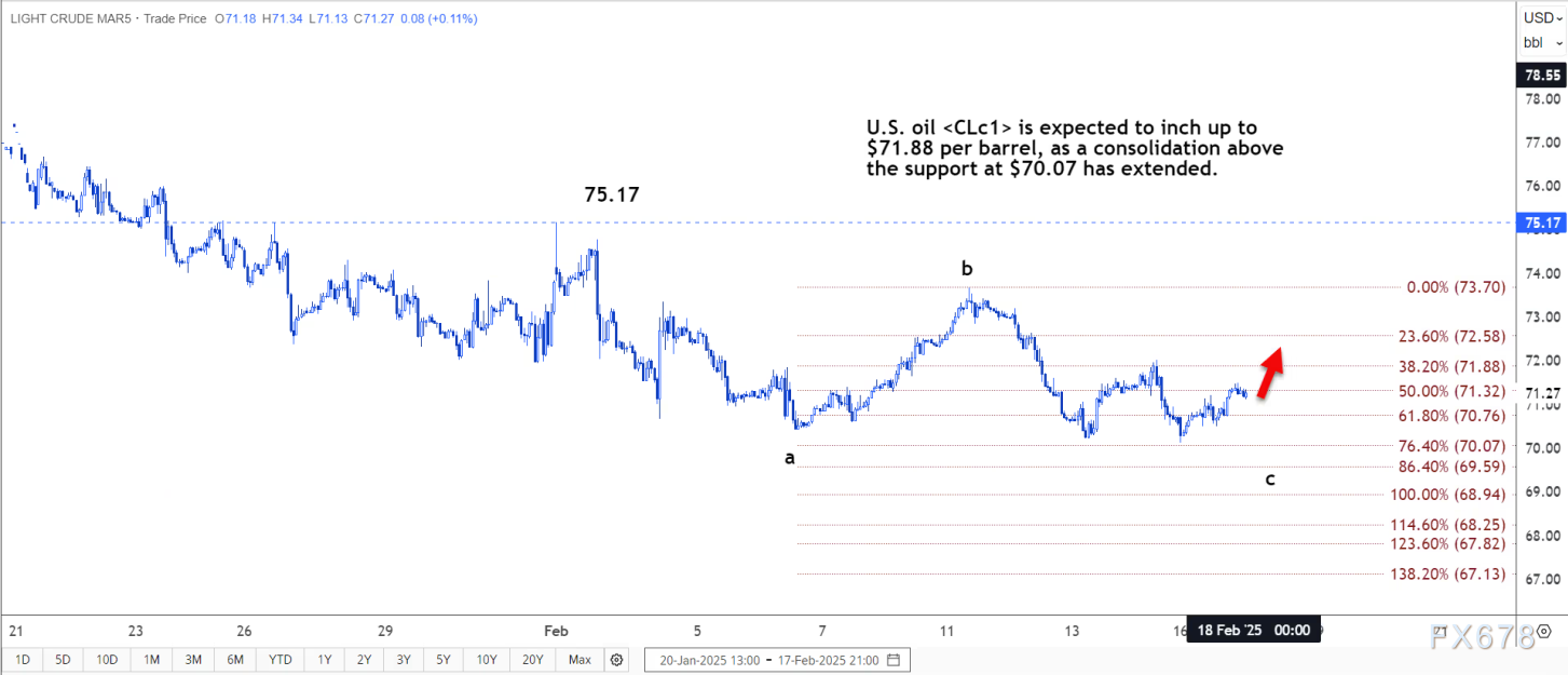 延长涨幅不妨控制正在 71.88 美元,由于从 75.17 美元入手下手的三浪周期看起来并不完善。假设 c 浪等于 a 浪,则 c 浪不妨行进至 68.94 美元。