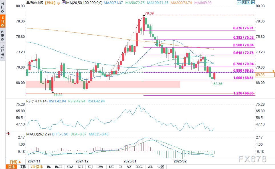 自价值从79.39的高点下跌以还,正在回调进程中众次受到这些价位的影响。眼前价值亲近68.61这一闭节撑持位,即时撑持位正在67.06美元,若该场所被有用跌破,那么下一个撑持位恐怕看向66.05;反之,若能正在此企稳反弹,上方则需眷注 69.85,正在此之上的阻力位为70.94。