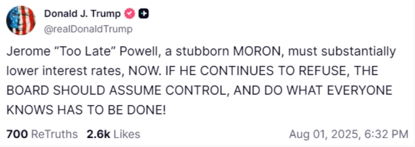 本地光阴8月1日,美邦总统特朗普正在社交平台“实正在社交”发文,倡议美联储主席鲍威尔退职。