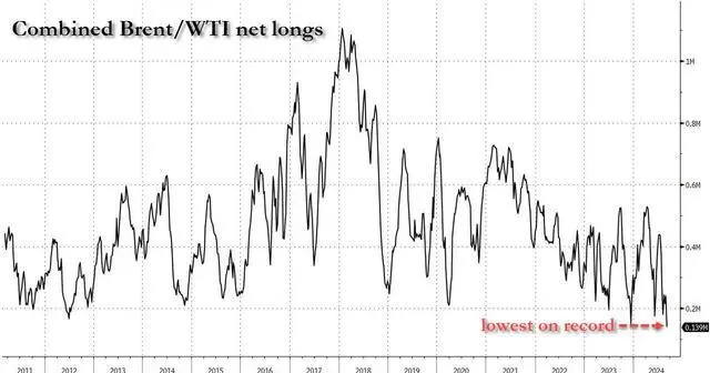 目今,对冲基金和其他基金司理对原油的看跌水平抵达了亘古未有的程度。截至9月3日当周,四种布油和美油合约的净投契性众头头寸仅占未平仓头寸的2.3%,为2011年头以还的新低,乃至比新冠肺炎疫情时代的低点还低2个百分点。