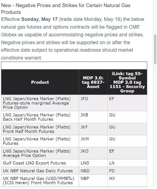 美邦时候5月7日,芝商所(CME)颁发告示称,从5月17日日曜日着手,一面自然气期货和期权合约将正在CME Globex中被标帜为可能接受负代价。其它,一面精粹能源产物的期货合约也将被答允举行负代价往还,生效日同样是5月17日。