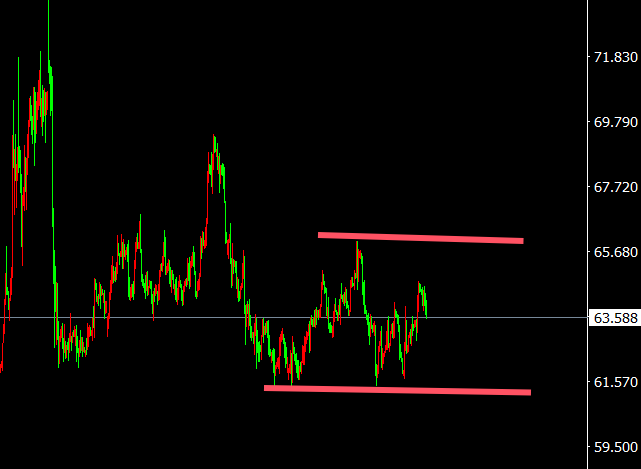 原油周三颠簸下行,当天最高64.6,最低63.6,日线,日线看油价仍是呈大区间运转,四小时线,颠簸,目前颠簸还将先下行,下方先看63,破位持续下跌,小时线,颠簸下行,综述日内操作思绪以颠簸为主