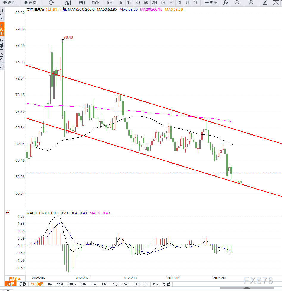 日线图形来看,价钱已衔接数日运转正在合键均线下方,体现光鲜的空头分列方式。眼前WTI交投于58美元邻近撑持区间,若该价位被有用跌破,下一方向或指向56.40美元区域,为前期底部撑持带。