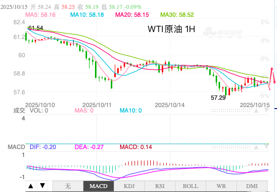 原油短线H)走势震动下跌再更始低,触及57.30。均线体系发散向下且压制油价,短线客观趋向对象向下。早盘油价自底部反弹,从力度上相对弱势,MACD目标正在零轴下方运转,空头动能仍占上风,估计日内原油走势将震动下跌运转为主。
