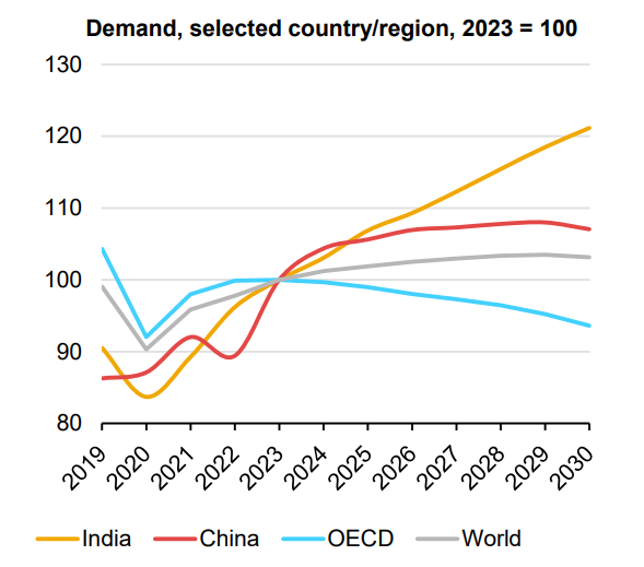 正在IEA最新的揭晓的《2030年印度石油市集瞻望》的说明叙述中则显示,将印度与中邦、经合机闭以及宇宙对待原油的需说情况实行了比拟,从图中可睹,大个人邦度对待原油需求将慢慢放缓。