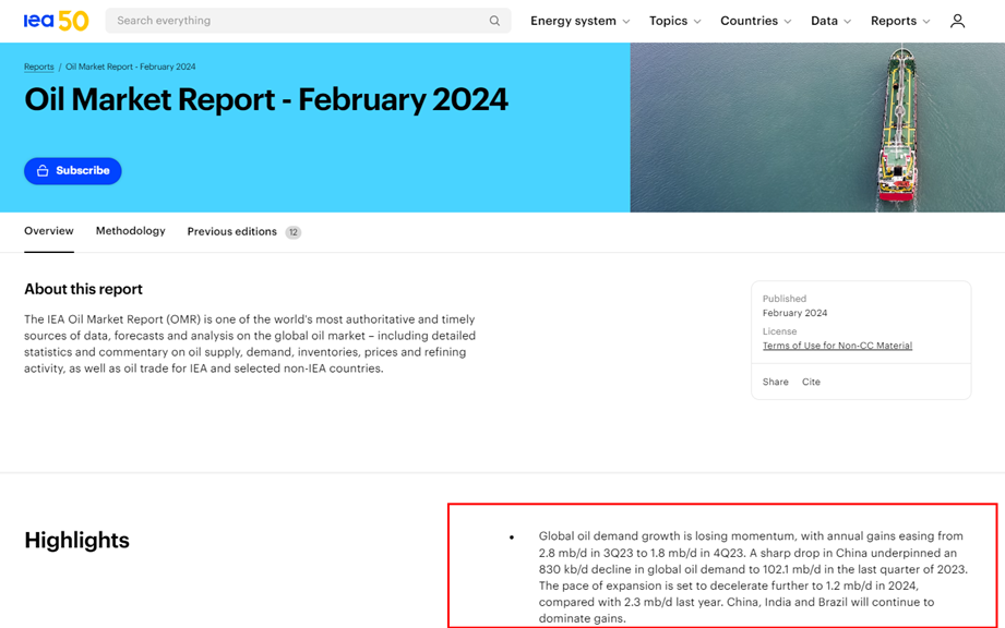 需求方面,IEA正在本年2月揭晓的叙述显示,环球石油需求增进正正在失落动力,年增进从23年第三季度的2.8百万桶/日放缓至23年第四序度的1.8百万桶/日。