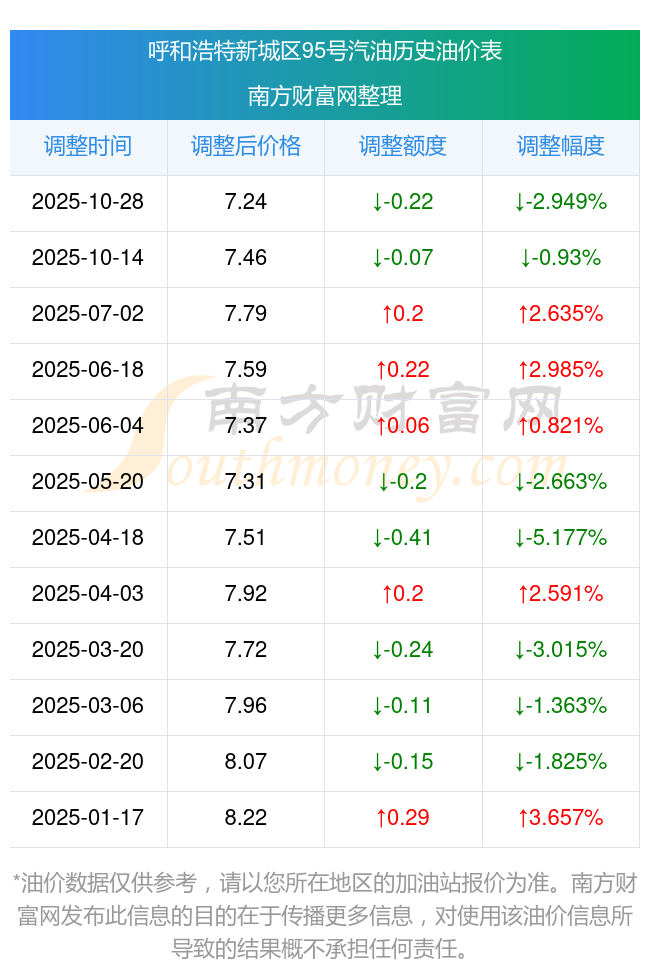 汽油、柴油11月9日每升最新价值为:95号汽油为7.29元,下跌了0.22元;92号汽油为6.8元,下跌了0.21元;89号汽油为6.38元,下跌了0.2元;0号柴油为6.41元,下跌了0.22元,调治时光为10月28日。 下一轮油价调治时光11月10日24时,隔断现正在再有1.07天。 2025年