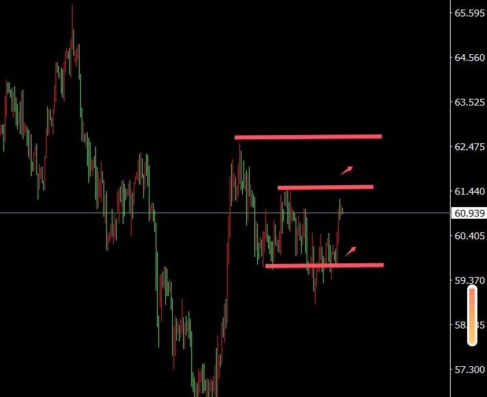 原油周二轰动上行,当天最低59.6,最高61.2,日线,日线看油价尚有上涨的势头,上方闭切62和63,四小时线,轰动上行,小时线,轰动上行,但短线有回调的势头,下方闭切60和59,日内操作思绪以轰动上手脚主
