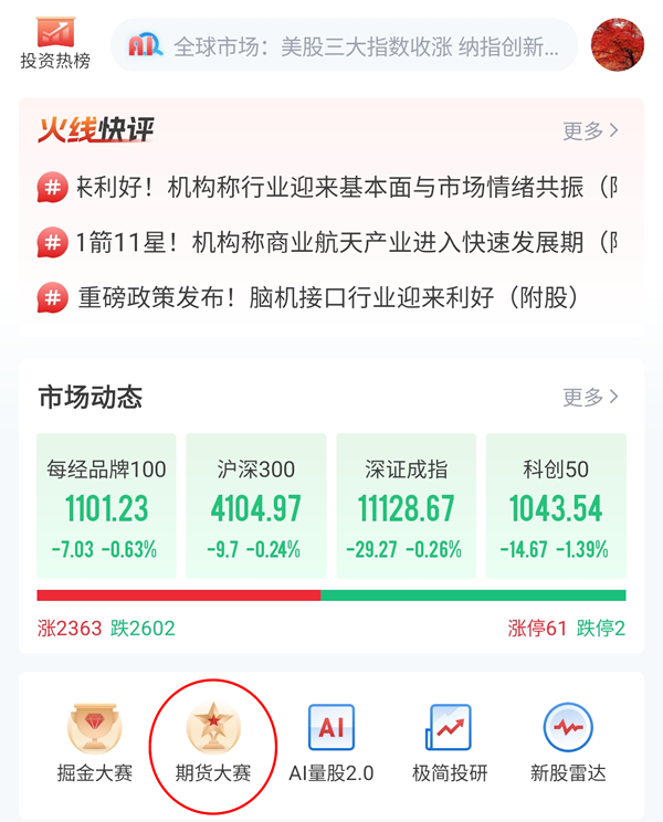 投资的实质是认知的变现,而认知来自施行。与其正在股票的涨跌中焦心,不如来期货模仿大赛里练手100万虚拟资金,零本钱试错,又有线日起,翻开逐日经济音讯APP,循序点击个人订制-期货大赛,即可报名参赛,开启你的新投资途程吧!