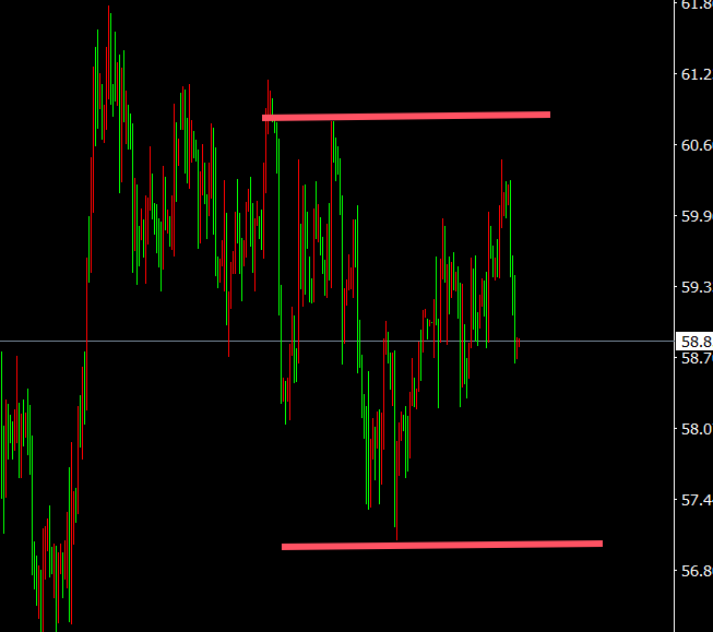 原油周一未能延续上涨,回调一波,当天最高60.2,最低58.6,日线,日线看油价呈大区间颤动,目前另有回调的空间,下方体贴57一线,四小时线,颤动,低位收十字星,先看58一线能否维持住,小时线,颤动下行,目前低位颤动,上方体贴60一线,日内操作看颤动下行,核心看57一线维持