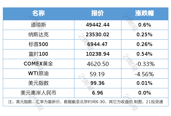 纽约股市三大股指1月15日上涨。截至当天收盘,道琼斯工业均匀指数比前一往还日上涨292.81点,收于49442.44点,涨幅为0.60%;准绳普尔500种股票指数上涨17.87点,收于6944.47点,涨幅为0.26%;纳斯达克归纳指数上涨58.27点,收于23530.02点,涨幅为0.25%。